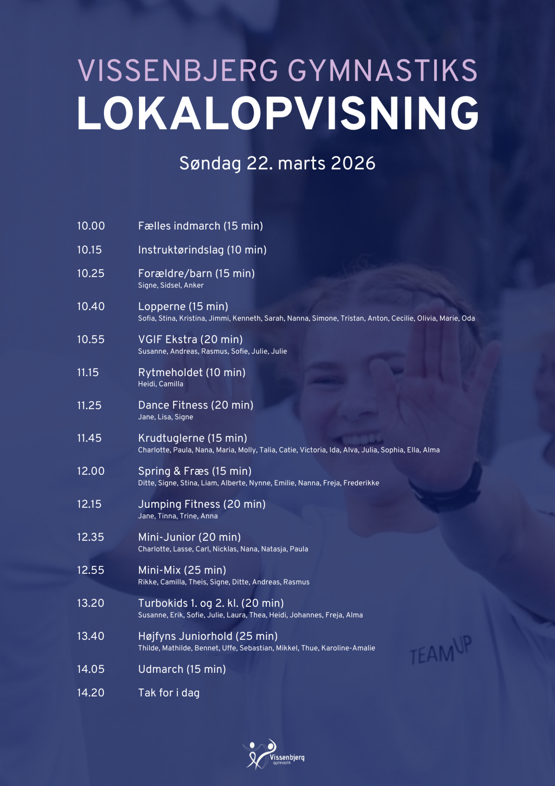 Alle gymnaster og instruktører mødes i hal 2 kl. 09.45 til opstilling til indmarch. Man skal være omklædt i opvisningstøj/holdtøj.